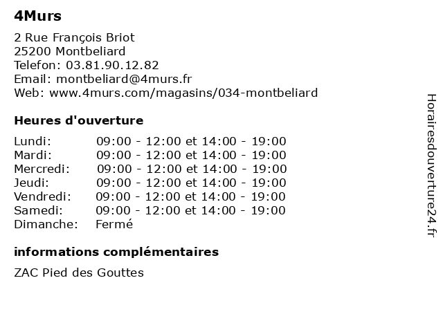 horaires d ouverture 4murs montbeliard montbeliard 2 rue francois briot zac pied des gouttes trouverouvert